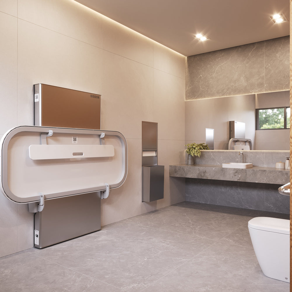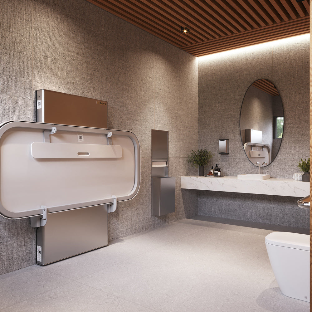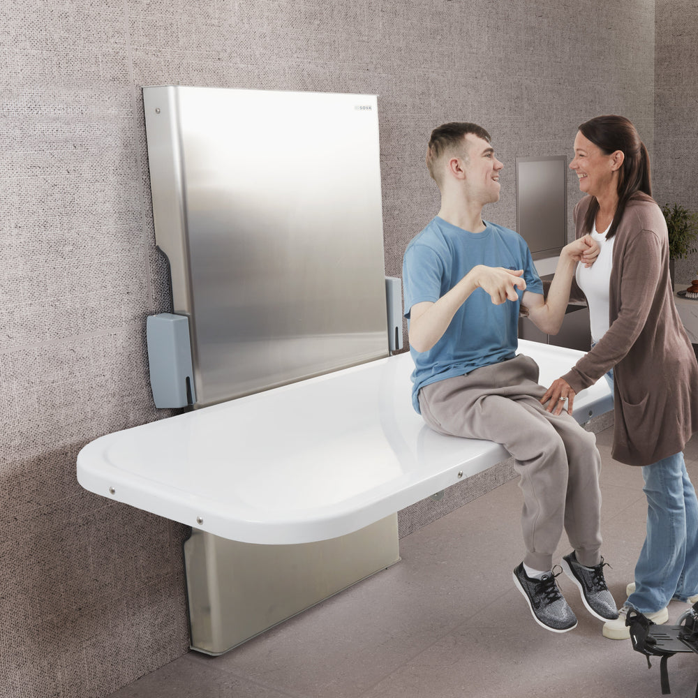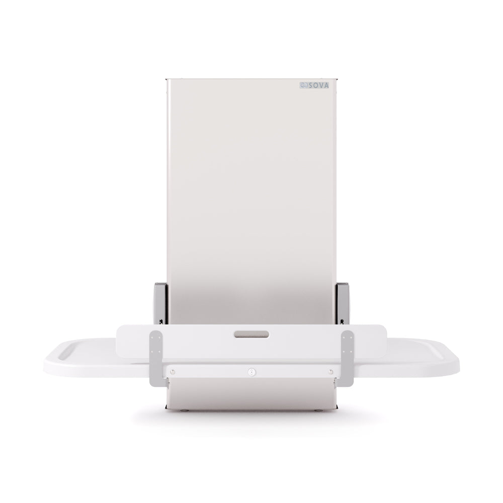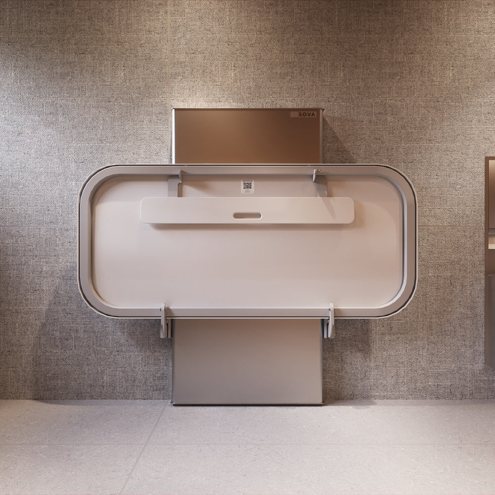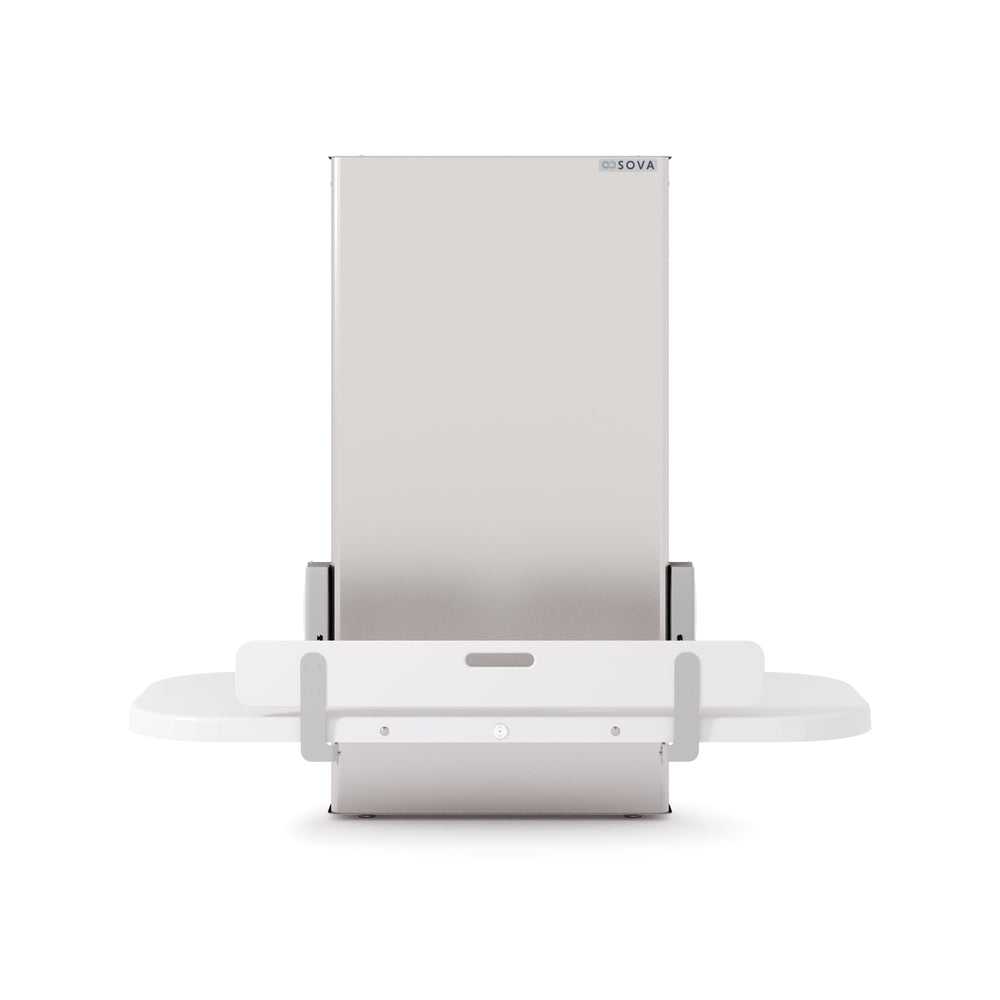 The height-adjustable Sova Ascent Universal Changing Table redefines inclusion in public washrooms with its accessible design, intuitive features, and simple wall-mount installation. Made in the USA with primarily American components. Weight capacity: 500 lbs.