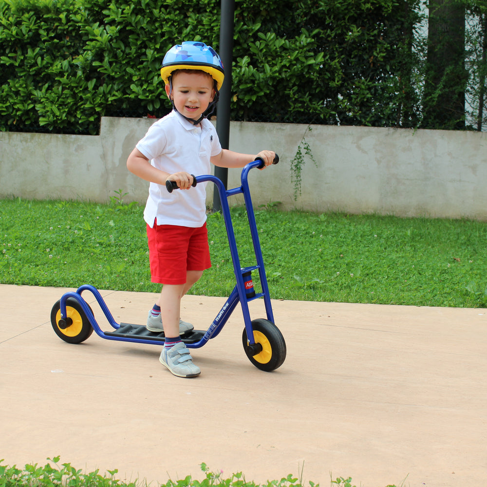 Kick scooter has a large footrest for greater stability when riding, Fixed height fork with anti-suffocation crossbar and steering lock, Steering design eliminates pinch points and the angle design reduces risk of the scooter tipping while riding, Non-toxic, UV-resistant powder-coated steel frame, Anti-puncture rubber wheels are durable and do not need to be inflated