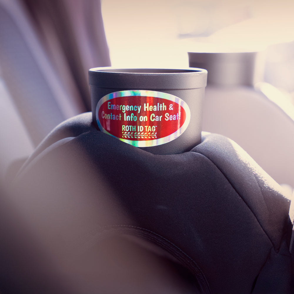 The ROTH ID TAG Identification System is an information tag that can be affixed to a child’s car seat. In the event of an emergency, the tag pulls from the car seat and becomes an emergency identification wristband. ROTH ID TAGS are durable, reflective, waterproof/heat/UV resistant tag that adheres to almost any hard surface. The tag includes an area on the back for users to write emergency information, along with two adhesive strips to apply the ROTH ID TAG, and one adhesive tab to utilize the wristband when needed. In the event of an emergency, the ROTH ID TAG removable strip can be detached from the tag and used as an emergency medical wristband by first responders. This reduces the risk of misinformation or loss of information in chaotic emergency situations. To further aid first responders, each ROTH ID TAG Kit includes a Signal Tag, meant to be placed visibly on the top or side of the car seat.