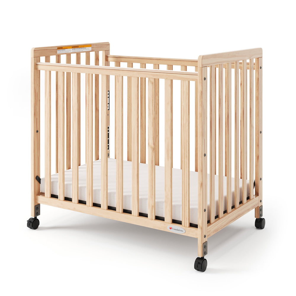 The SafetyCraft Fixed-Side Compact Crib offers safety and durability without compromising affordability. High quality construction includes advanced strength fasteners, mortise and tenon joinery, and a solid steel box frame crib mattress board that adjusts 2 heights. Offering incredible value for home and commercial daycare settings, the SafetyCraft portable crib comes in a natural wood finish and features a plastic teething rail for protection and longevity of the crib. A 3” InfaPure ultra-durable foam mattress and 2” non-marking ultra-quiet casters (two locking) are included. Safety Craft childcare cribs are available with Clearview or Slatted end panels.