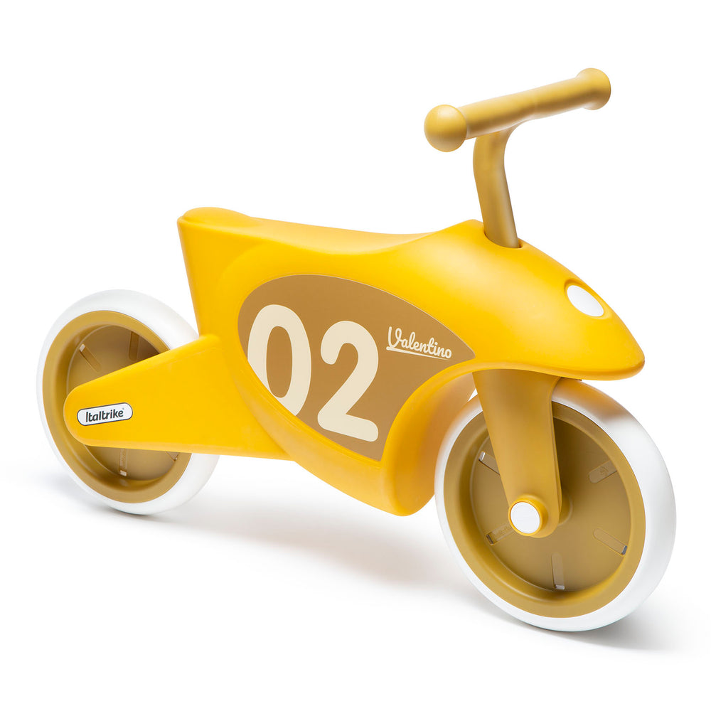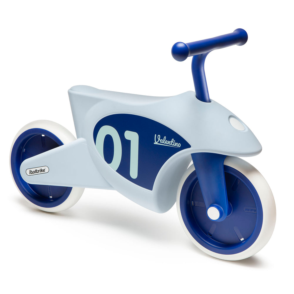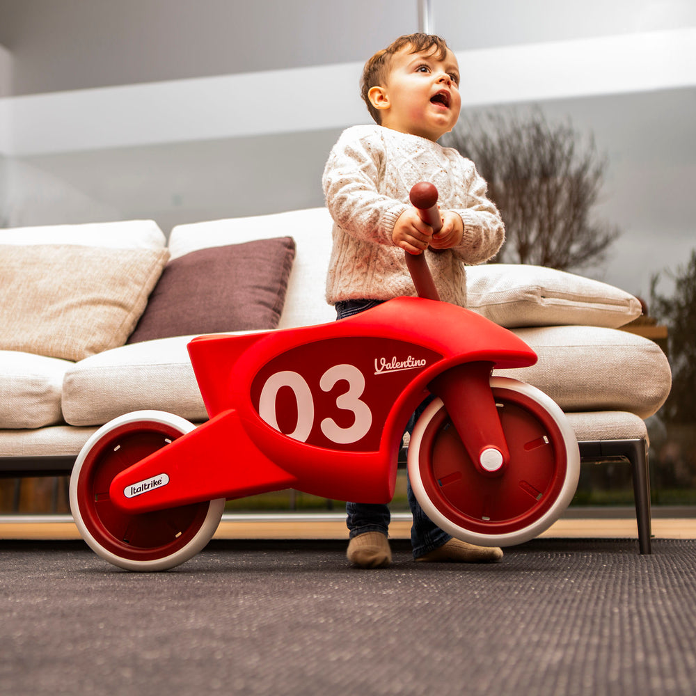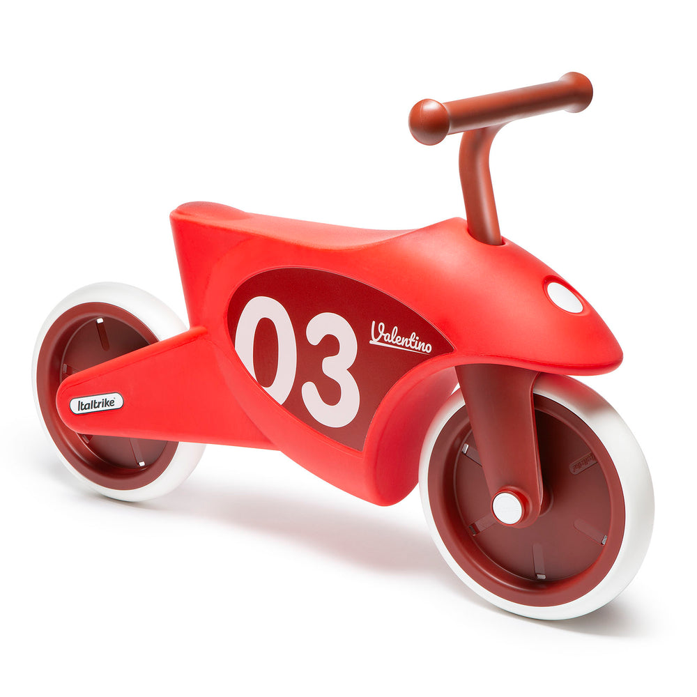 Valentino is their first balance bike, designed for children from 2 to 4 years old. Featured with an attractive and modern design. Lightweight and easy to handle, it is perfect to accompanying motor and cognitive development while playing in movement. Its rubber-coated wheels guarantee effective grip on the floor and the steering limit increases safety and ease of maneuvering, for intuitive and dynamic use. Italtrike Valentino is selected ADI Design Index 2024, the container of the best Italian design., Designed for Balance & Coordination: A balance bike that helps children develop motor skills and coordination, with a steering limit feature to enhance control and safety., Safe & Kid-Friendly Design: Rounded shockproof shape, steering limiter for added protection, and compliance with European Toy Safety Regulations (EN 71, parts 1, 2, 3)., Indoor-Friendly & Durable: Rubber-coated solid wheels that won’t puncture or leave marks—ideal for indoor use, especially on wooden floors. Supports up to 55 lbs., Compact, Silent & Easy to Use: Lightweight, quiet, and easy to handle. Quick assembly: just insert the handlebar and rear wheel—Valentino is ready to go.
